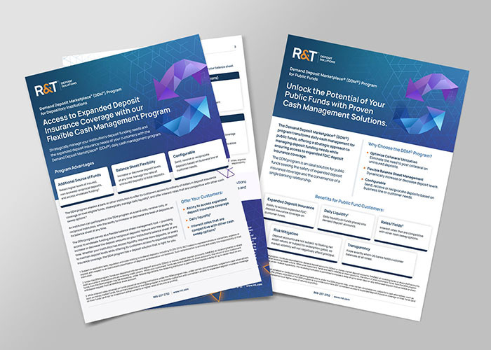 Serving national, regional, community, digital, and global banks, R&T delivers configurable cash sweep solutions, including the DDM℠, CDMX℠, and RTID℠ programs that support deposit growth, liquidity optimization, and customer retention.